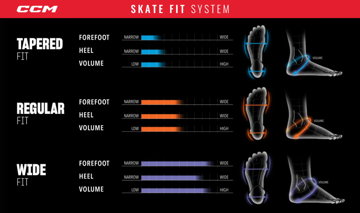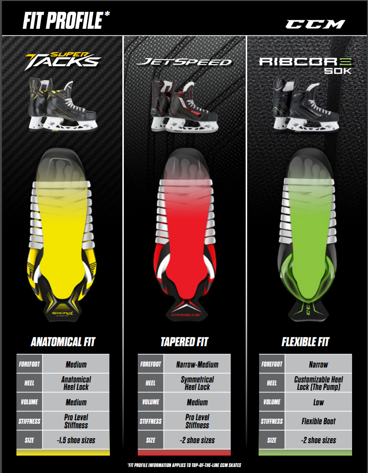 Before 2021, CCM skates followed the traditional D/EE width system, with each line (Jetspeed, Tacks, Ribcor) tailored to different foot shapes. In 2021, CCM introduced their Fit System — Tapered, Regular, and Wide — allowing each skate line to accommodate all foot types by offering multiple fit profiles across models.