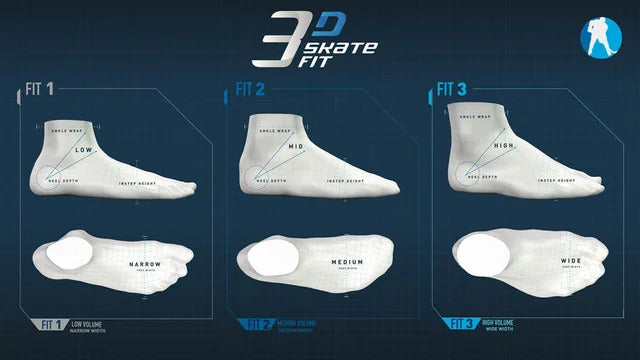 Before 2019, Bauer skates used a traditional D/EE width system, where D represented a standard width and EE was a wider option, with each skate line (Vapor, Supreme, Nexus) designed for specific foot shapes. In 2019, Bauer introduced the Fit 1 / Fit 2 / Fit 3 system, offering multiple fits within each skate line to better match individual foot profiles — narrow (Fit 1), regular (Fit 2), and wide (Fit 3).
