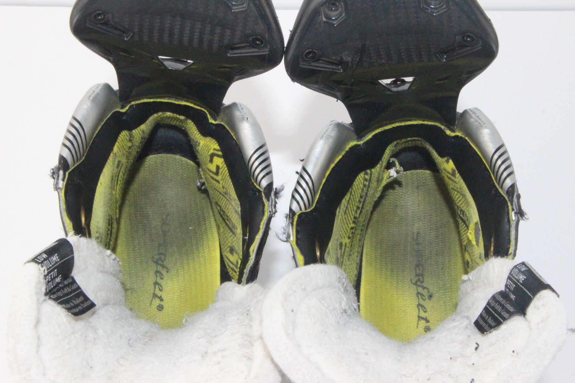 The interior liner near the heel on the inside edge of both skates has been worn through.