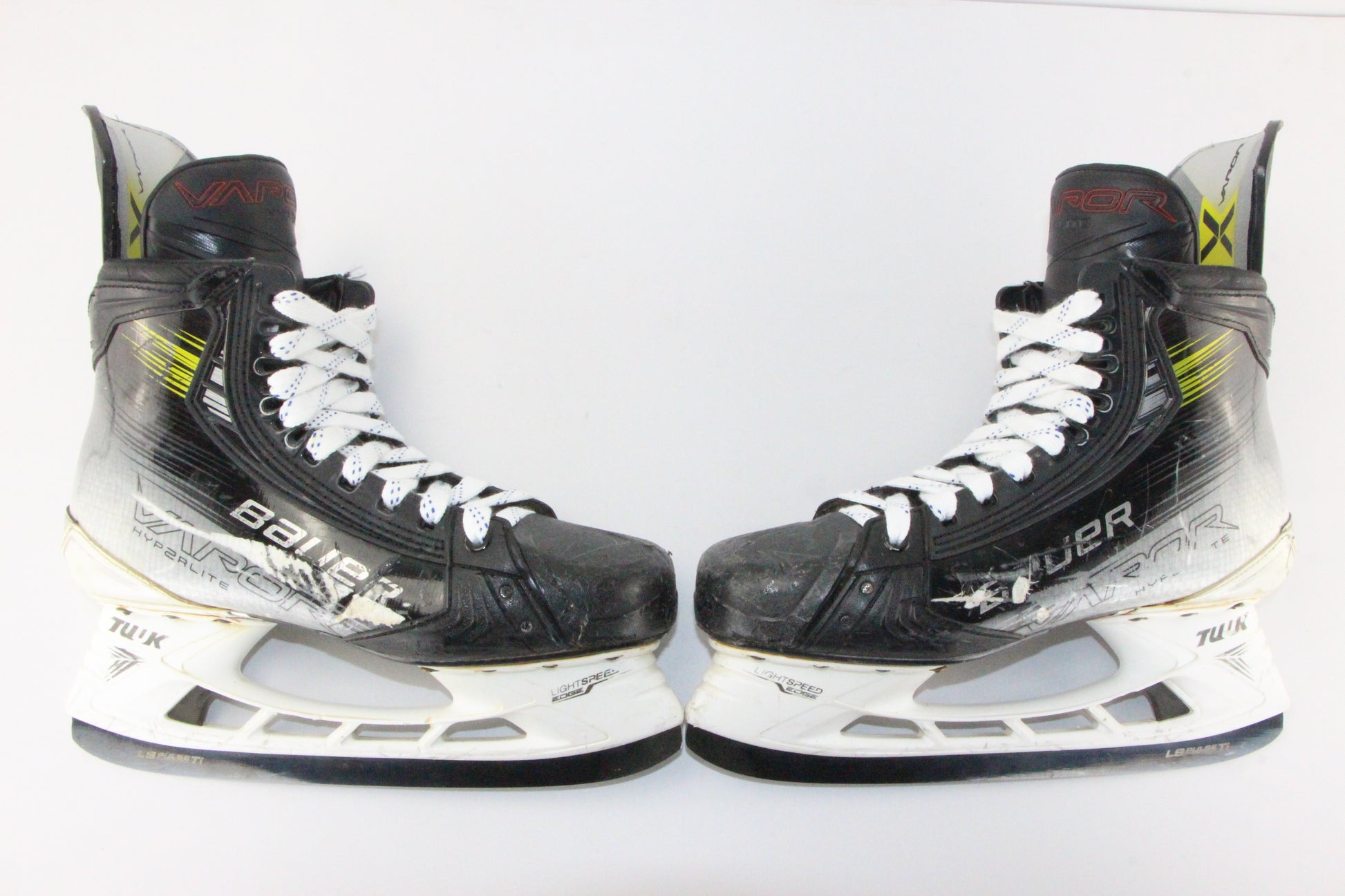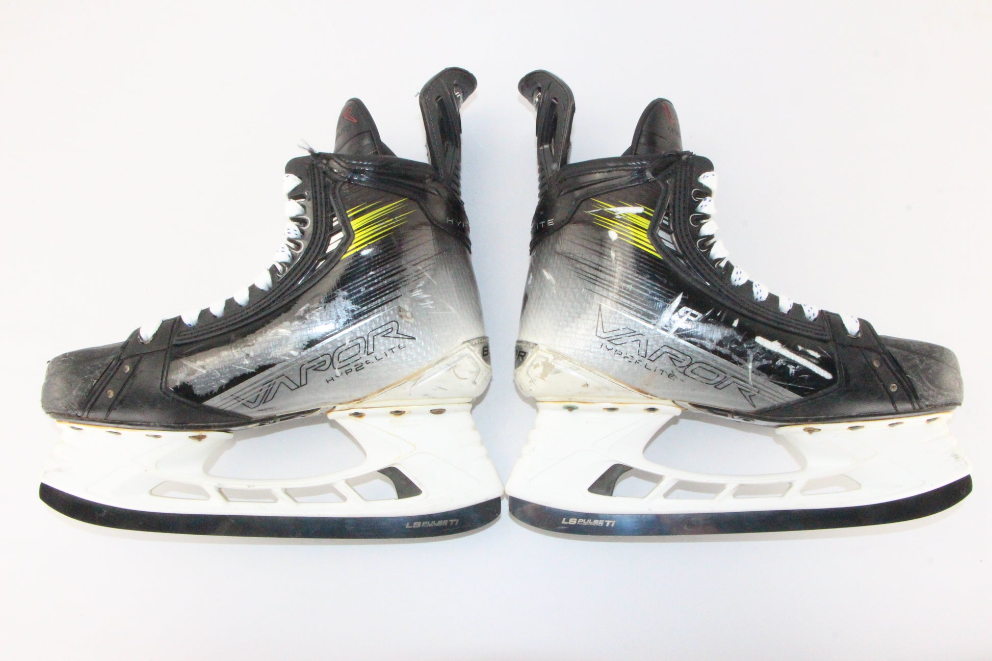 Finest grade for all typical used skates. Signs of use, but they are minimal. Some scratches on blade holder, noticeable cuts on toe cap. Some paint blemishing, but generally not apparent.
