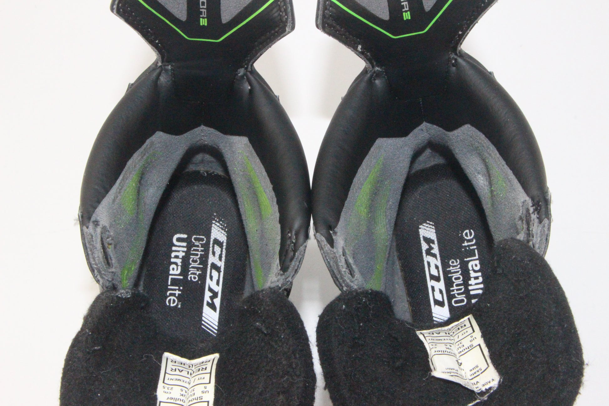 This pair is a used CCM Ribcor 100K Pro in Size 4, Fit Regular.